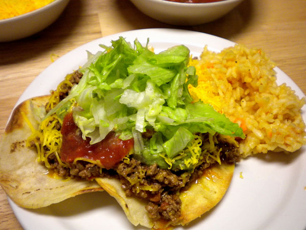 Homemade tostadas and Spanish rice.