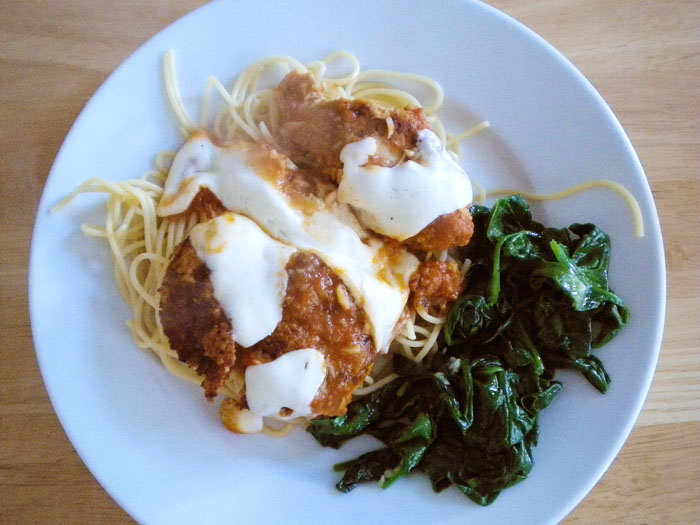 Chicken parmesan with sauteed spinach.Grilled caprese sandwich (fresh mozerella, tomatoes, basil), fruit salad, green salad with cucumber, tomato, and parmesan.Caprese salad.Blanched asparagus with brown butter and parmesan, sauteed spinach and roasted lima beans, three bean salad.Salad with corn, celery, tomatoes, avocado, and tortilla chips.Greek salad, spinache quiche, and roasted potatoes.Caprese salad, scrambled eggs, and green salad with white beans and parmesan.