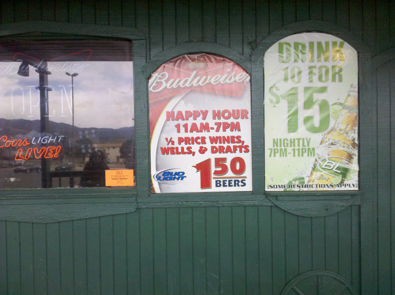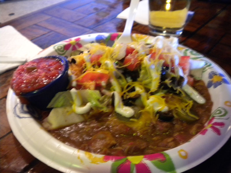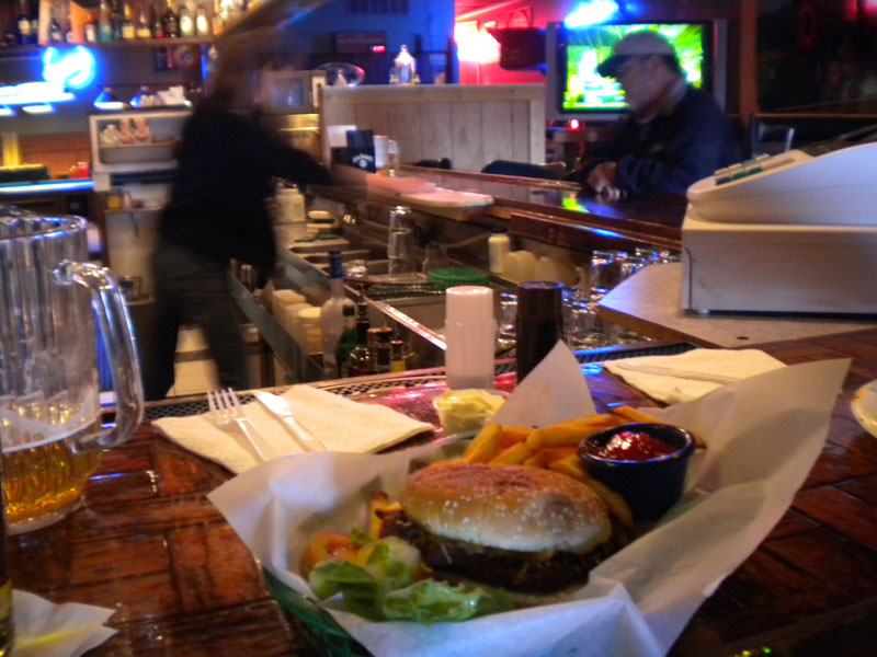 I ordered the half-pound smothered burrito. The girlfriend ordered a burger. Despite being served on a paper plate with plastic utensils, the food was good. For bar food, it was outstanding. Adrienne says the burger was a little overcooked, but the fact that they offered mayonnaise with it sort of makes up for it. As for my meal, I have no complaints. The burrito even had jalapenos in it. Perfect. And with a pitcher of PBR, extra-perfect. And before rush-hour traffic: Extra-extra-perfect.